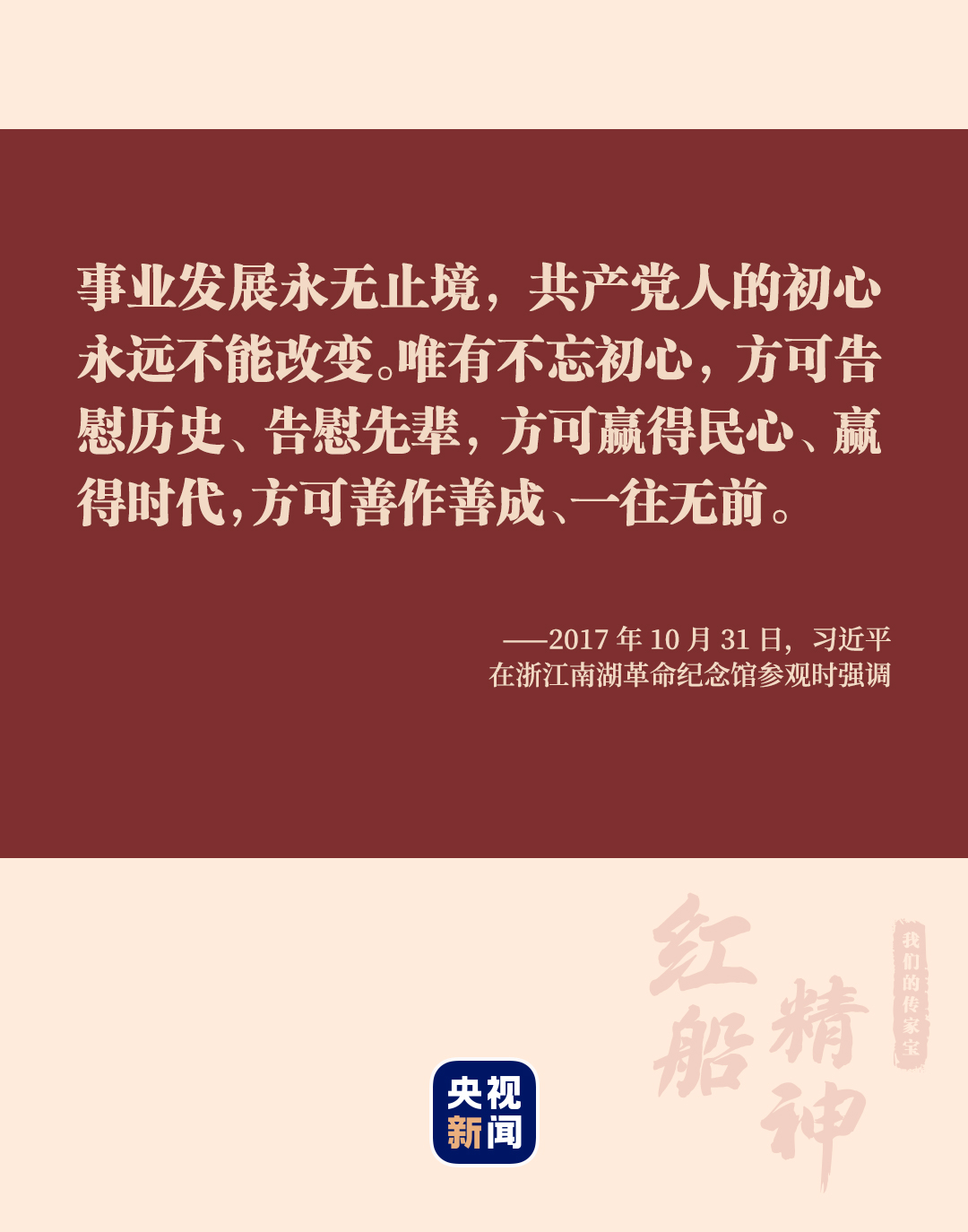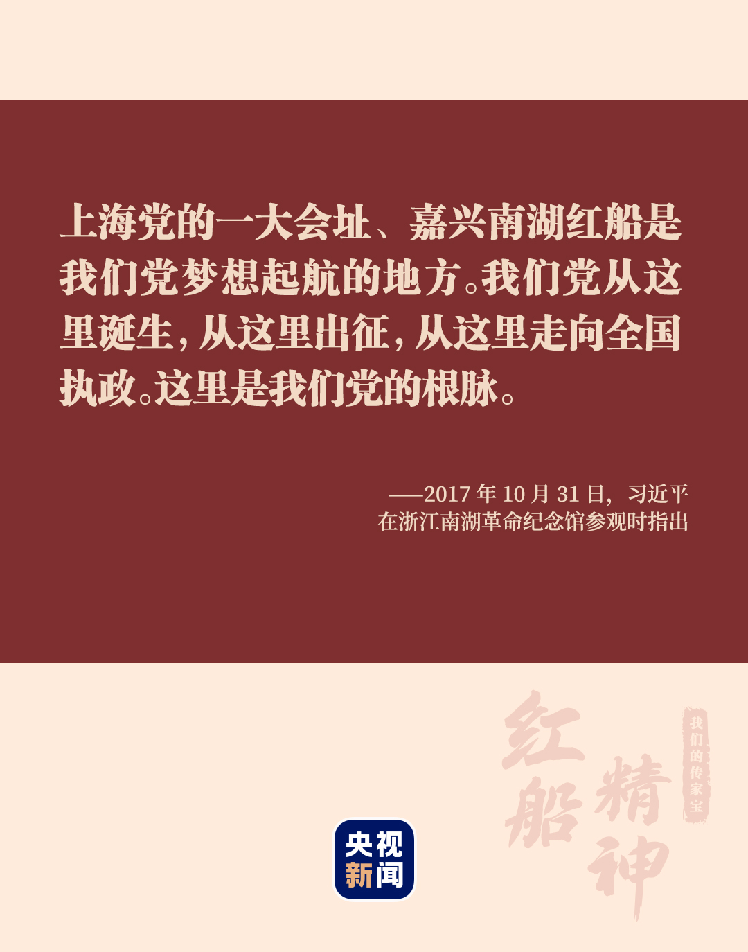 在浙江工作時(shí),習(xí)近平為南湖革命紀(jì)念館奠基。2005年6月,他在文章《弘揚(yáng)“紅船精神” 走在時(shí)代前列》中對(duì)“紅船精神”作出概括:“開(kāi)天辟地、敢為人先的首創(chuàng)精神,堅(jiān)定理想、百折不撓的奮斗精神,立黨為公、忠誠(chéng)為民的奉獻(xiàn)精神。”