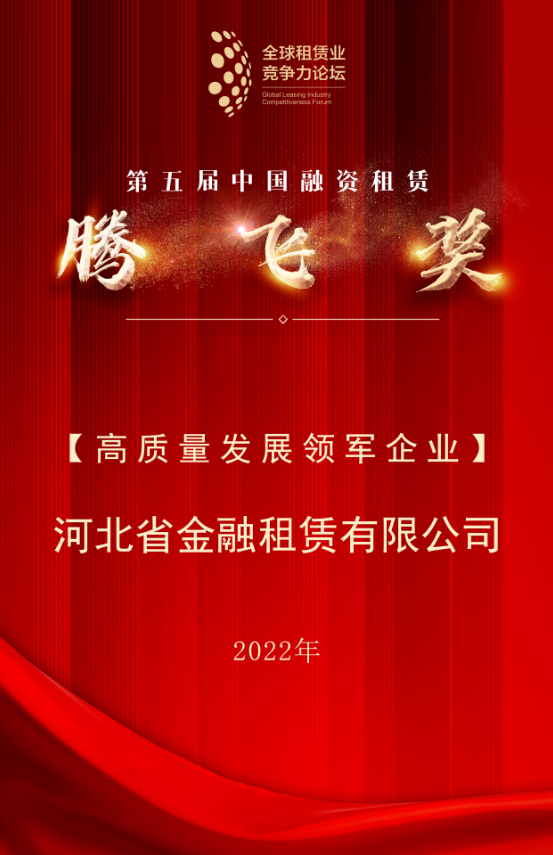 日前,第九屆全球租賃業(yè)競(jìng)爭(zhēng)力論壇年度峰會(huì)圓滿召開(kāi),河北省金融租賃有限公司(以下簡(jiǎn)稱“河北金租”或“公司”)再度攬下中國(guó)融資租賃“騰飛獎(jiǎng)”,榮獲“高質(zhì)量發(fā)展領(lǐng)軍企業(yè)”榮譽(yù)。